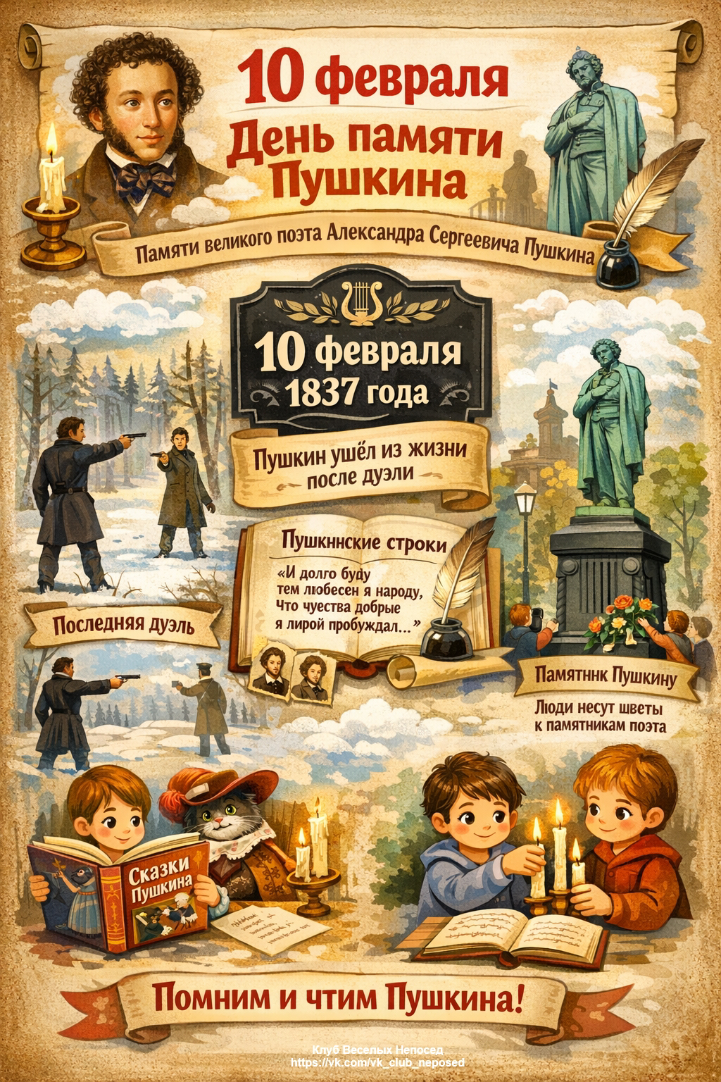 10 февраля - день памяти Александра Сергеевича Пушкина - великого русского поэта. Его литературное творчество сопровождает нас на протяжении всей жизни.