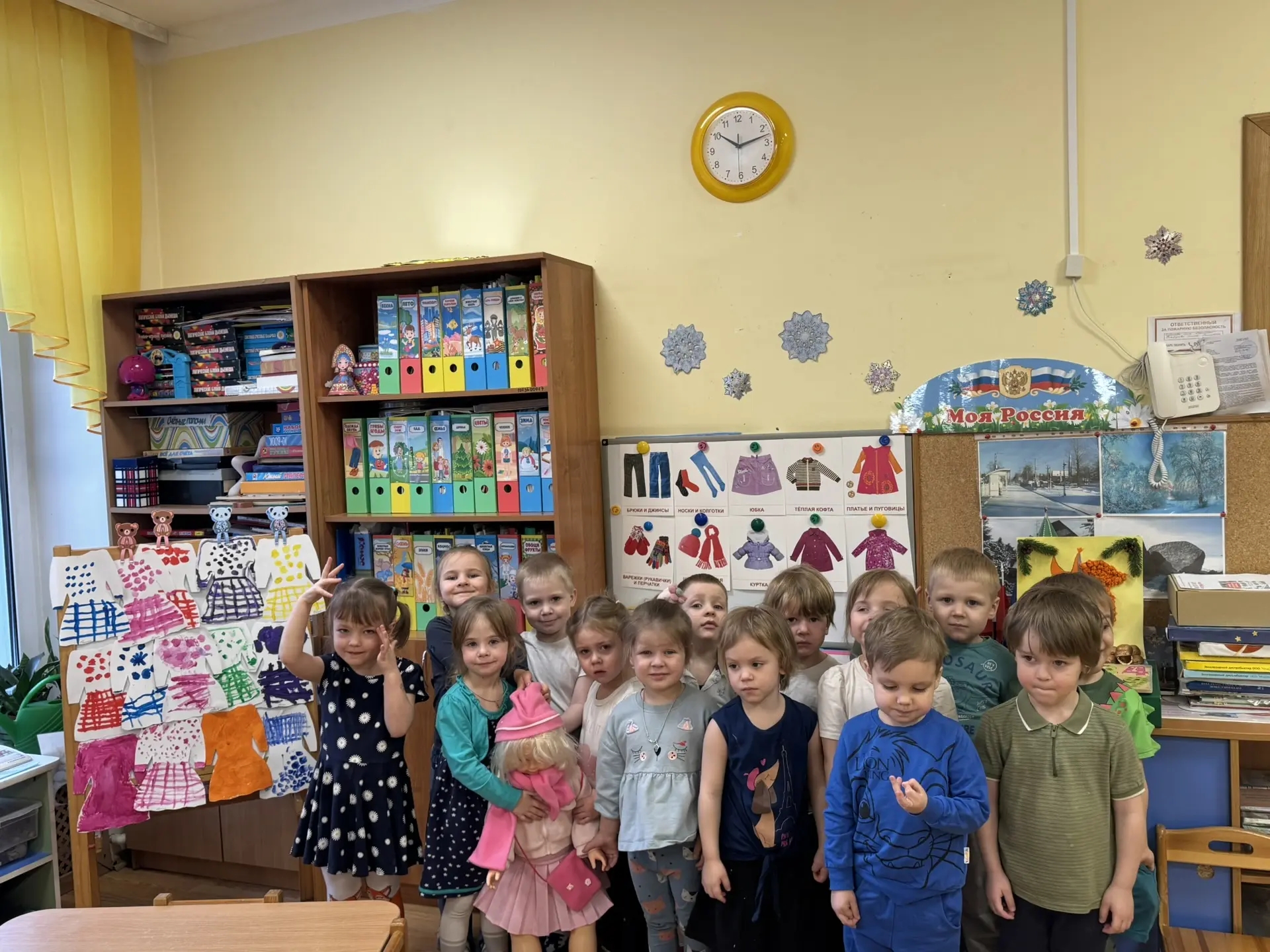 Юные воспитанники расширяли знания о предметах гардероба, постигали их роль в повседневной жизни и приобретали умение классифицировать вещи по сезонам. Для ребят организовывались познавательные игровые занятия, способствующие запоминанию названий предметов одежды и развитию умения выбирать подходящую одежду и обувь соответственно погоде. Малыши активно участвовали в интересных дидактических играх и занятиях: рассуждали, какая бывает одежда (летняя и зимняя). Детям особенно нравилось заниматься творческой деятельностью: рисованием нарядного платья для куклы Кати. Играли в забавную ролевую игру «Оденем куклу», заучивали трогательное стихотворение «Мой мишка», слушали занятную сказку о капризной одежде, обиженной за плохое обращение. Ежедневно дети охотно рассказывали друг другу, кто во что оделся утром, и осваивали важные правила ухода за вещами.