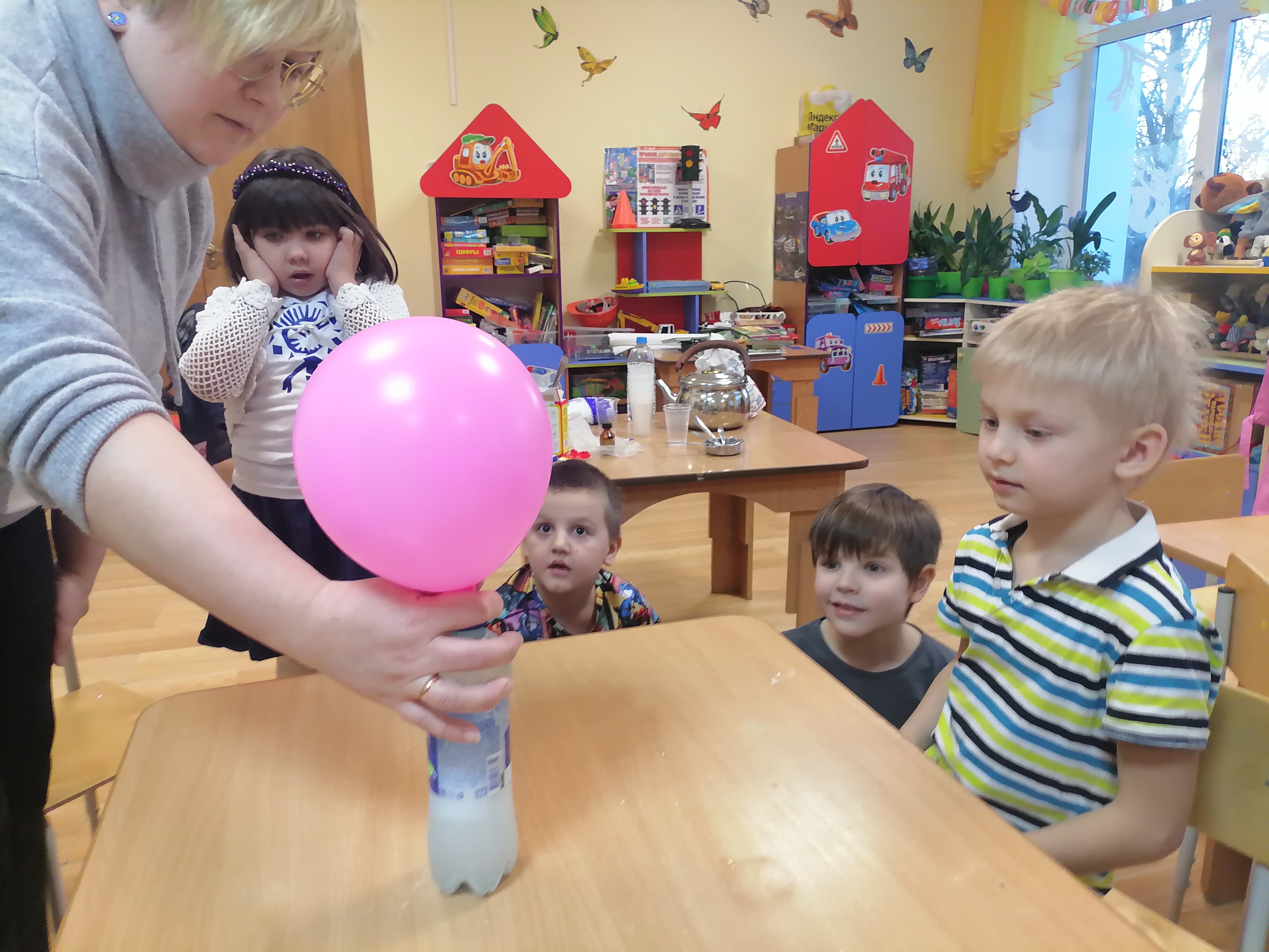 Первый этап включал в себя простой опыт с содой и уксусом. Дети насыпали в шар две чайные ложки соды, а в пластиковую бутылку добавили около трех-четырех ложек уксуса. Затем шар прикрепляли к горлышку бутылки и резко переворачивали, позволяя соде соприкоснуться с уксусом. Шар начинал надуваться, поскольку взаимодействие соды и уксуса вызывает выделение углекислого газа, который и наполняет шарик.