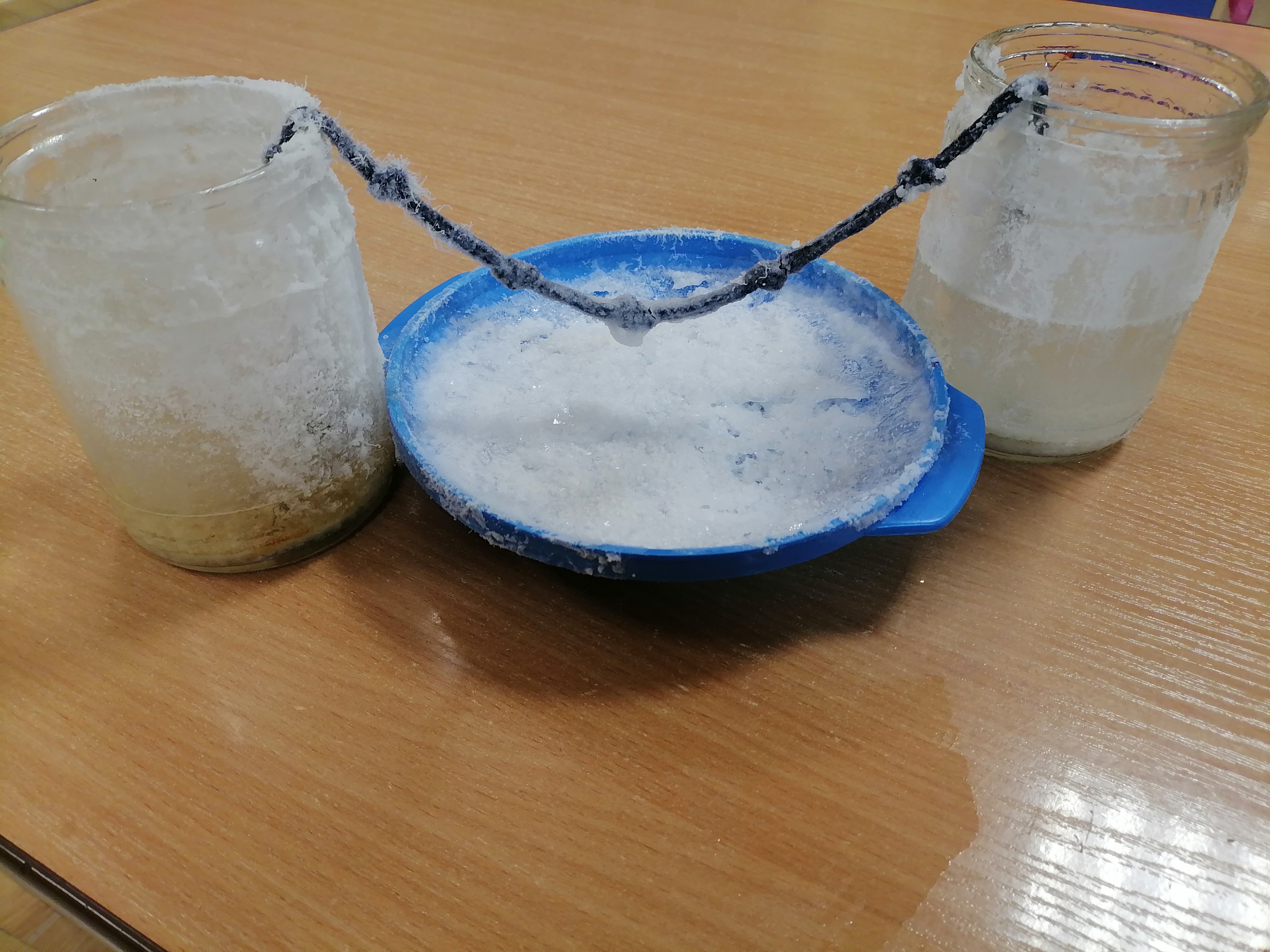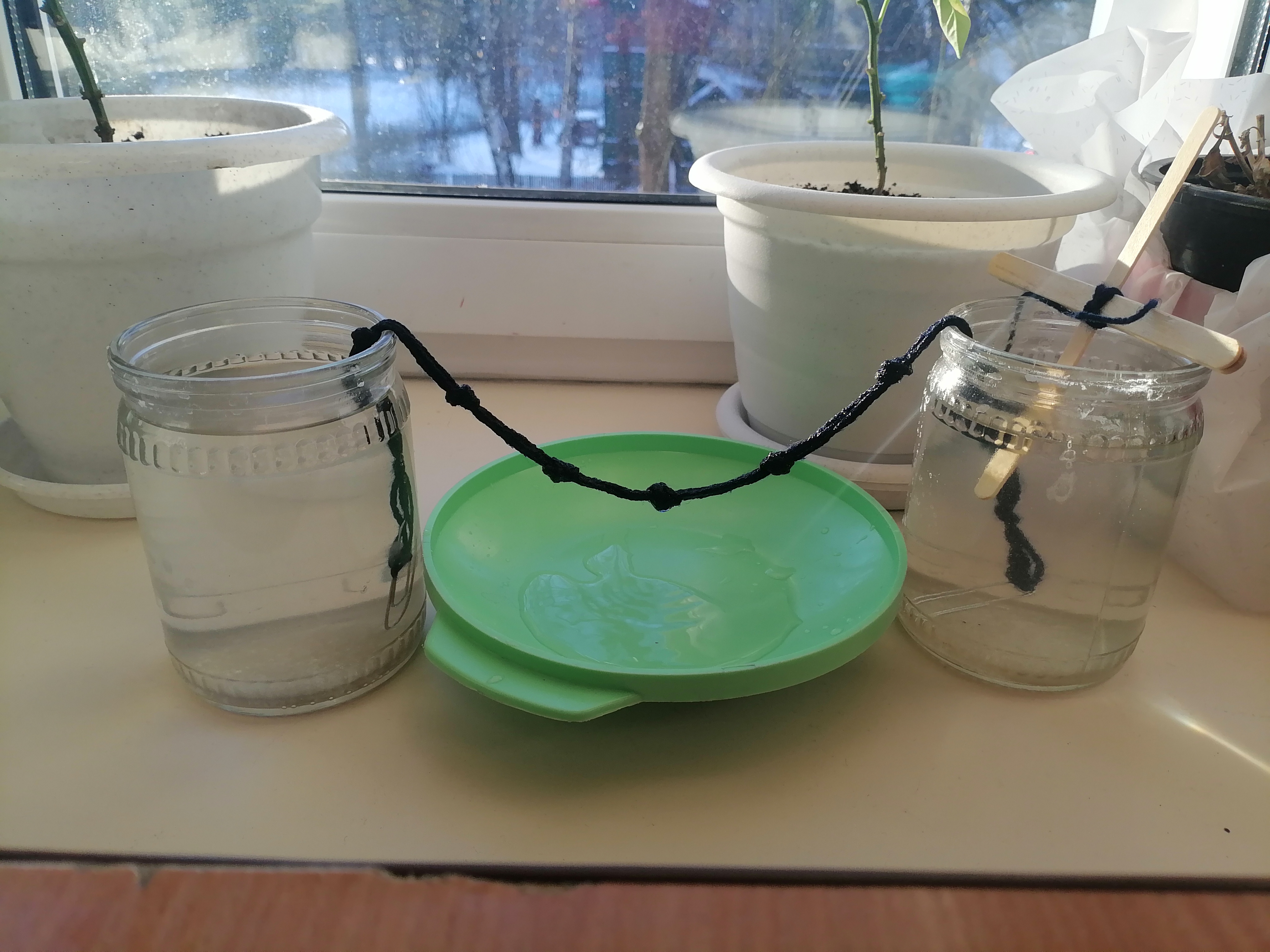 Далее самое интересное: между банками была натянута тонкая ниточка или леска, закрепленная таким образом, чтобы концы нити находились внутри растворов. Через некоторое время дети заметили удивительные изменения!
