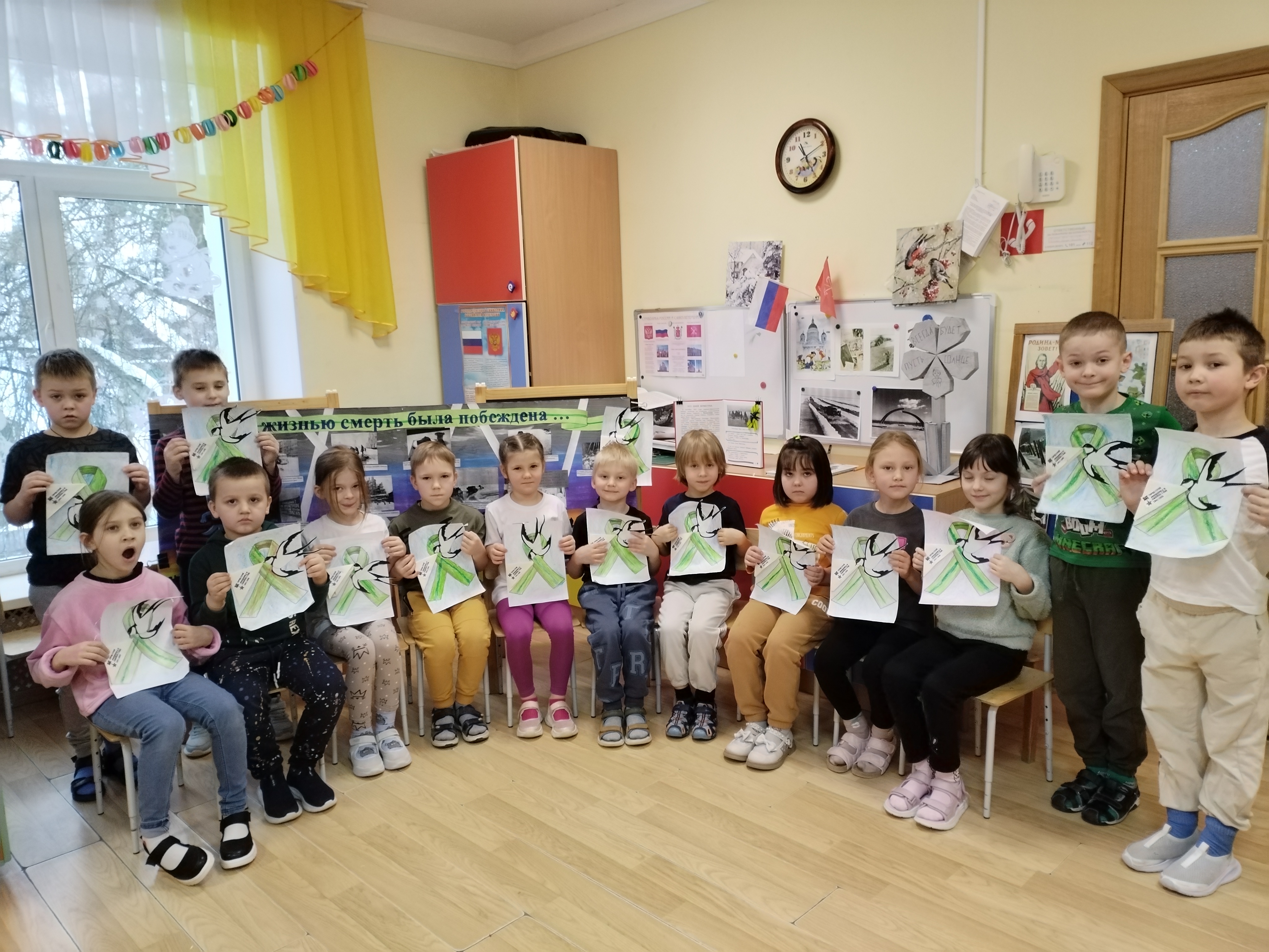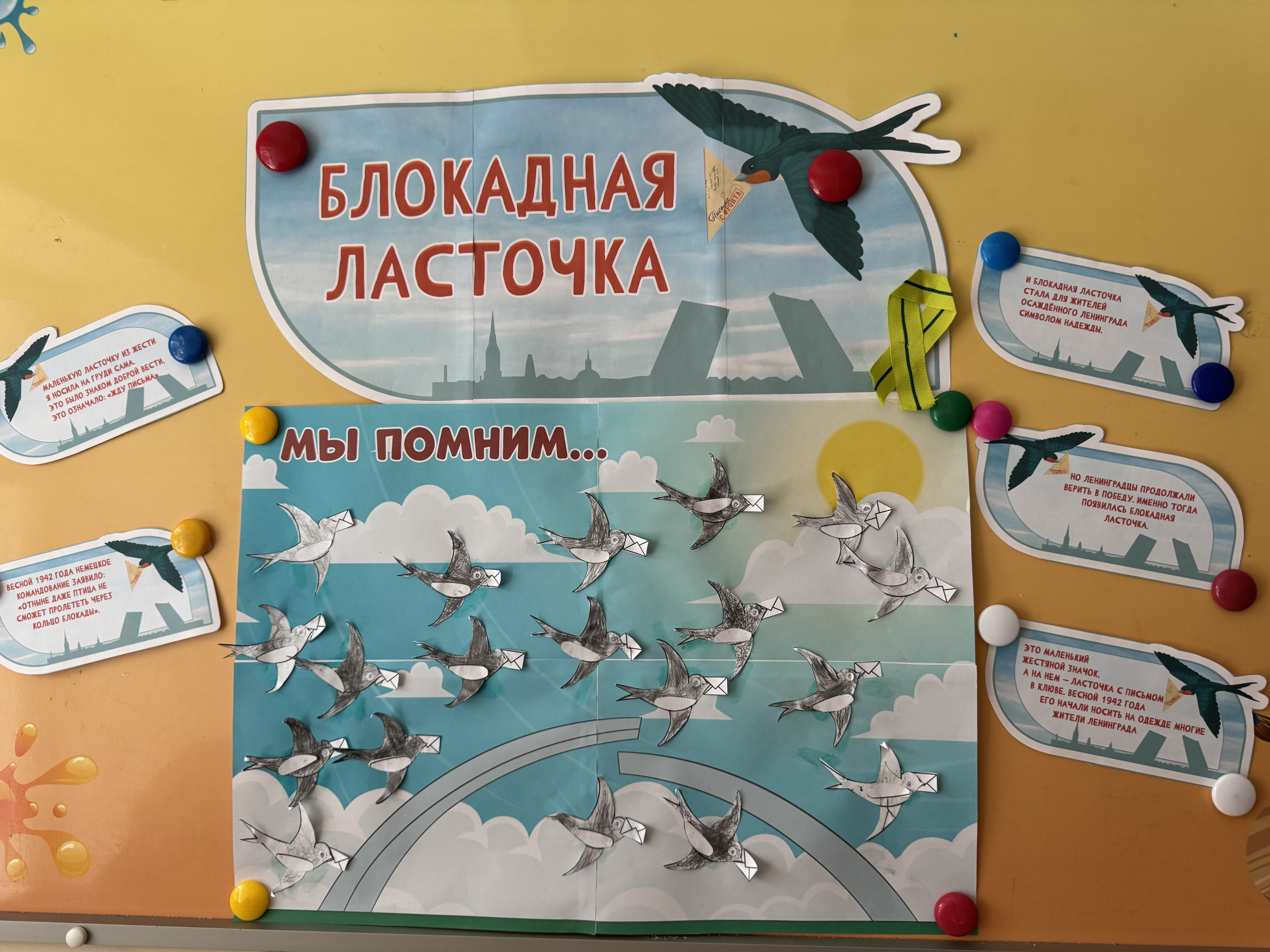 В нашей младшей группе прошла патриотическая акция «Блокадная ласточка», посвящённая героической обороне Ленинграда в годы Великой Отечественной войны.Дети услышали о символе надежды — ласточке с письмом в клюве, которую носили на груди жители осаждённого города, узнали, что «Блокадная ласточка» — это знак веры в Победу и скорые добрые вести.