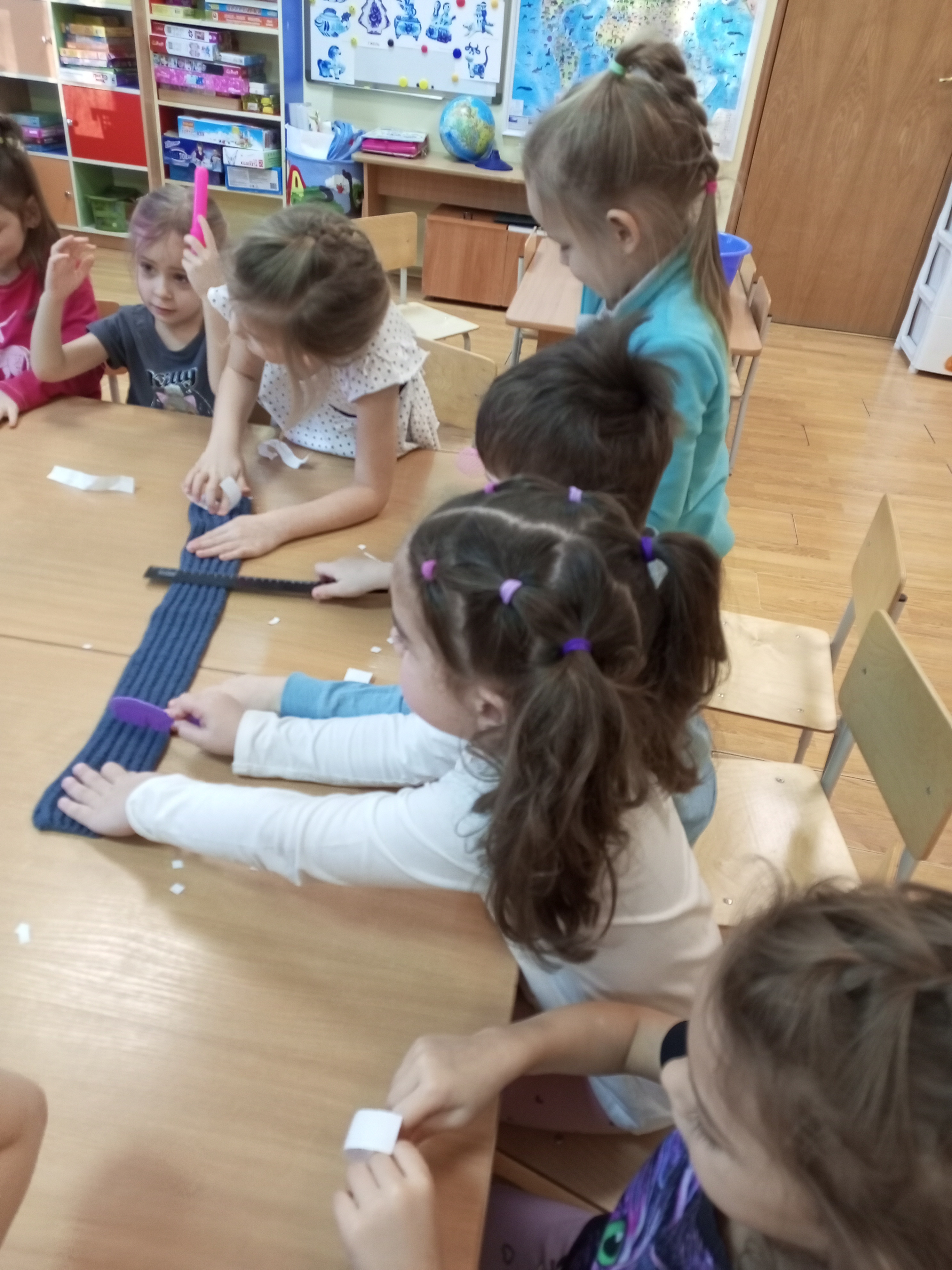 Дети натирали линейки и расчески о шерстяной шарф, шапку или волосы и наблюдали, как к предметам "прилипают" мелкие кусочки бумаги, а полоски фольги начинают "танцевать".