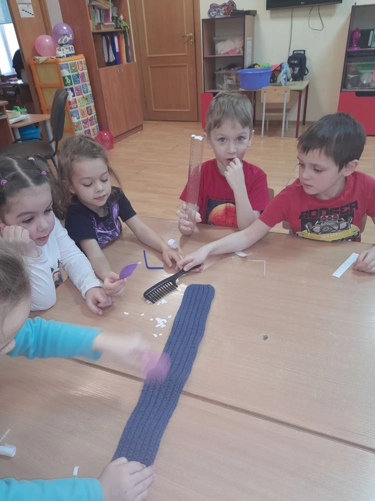 Также детей заинтересовала следующая, более сложная тема: статическое электричество. Воспитатель объяснил детям, как возникают заряды и как они могут влиять на предметы вокруг нас. Дети активно задавали вопросы и делились своими наблюдениями из жизни.