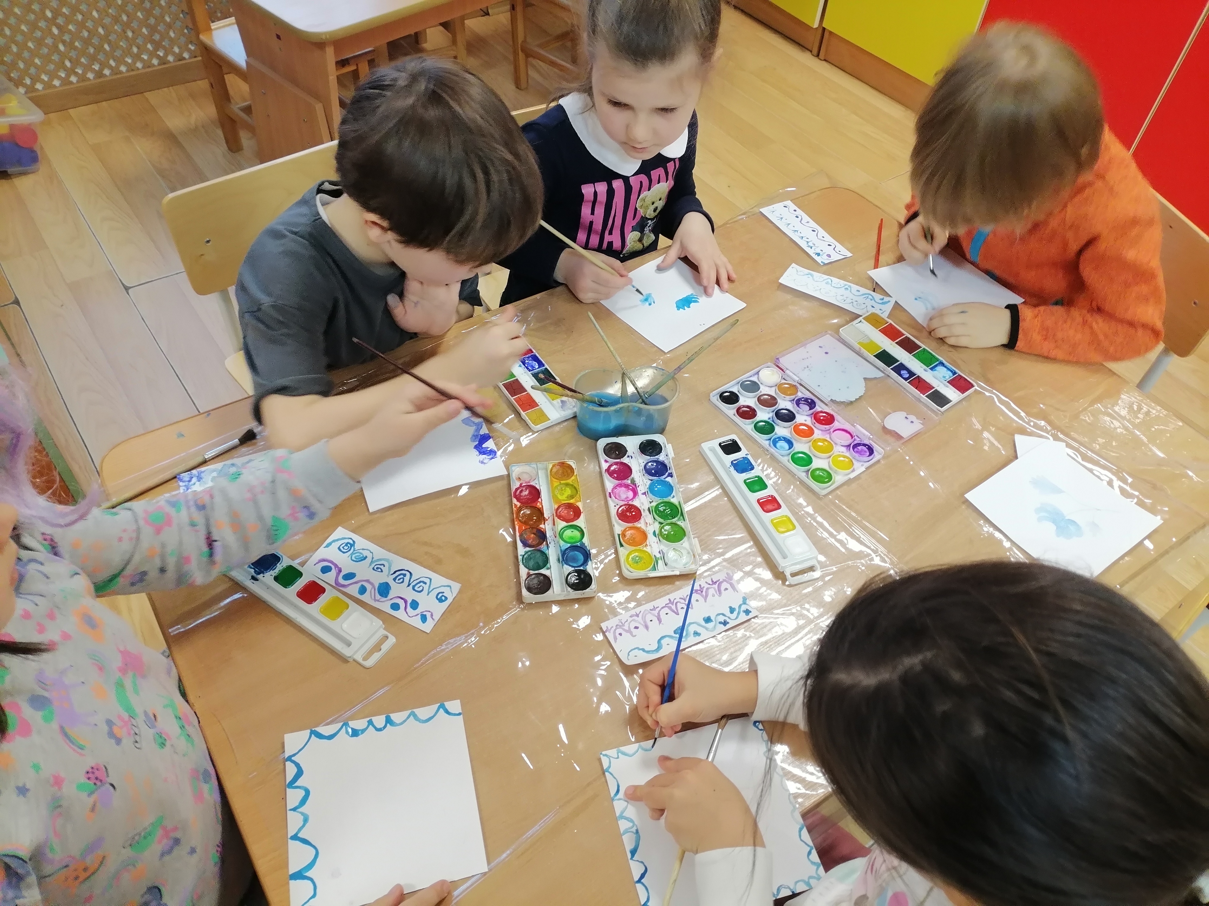 Затем наступила самая захватывающая часть занятия – создание собственных произведений искусства. Каждый ребенок получил белый хлопковый платочек и краски. Воспитанники проявляли свою фантазию, стараясь повторить характерные элементы гжельского стиля: изящные лепестки цветов, завитки листьев и плавные линии узора.