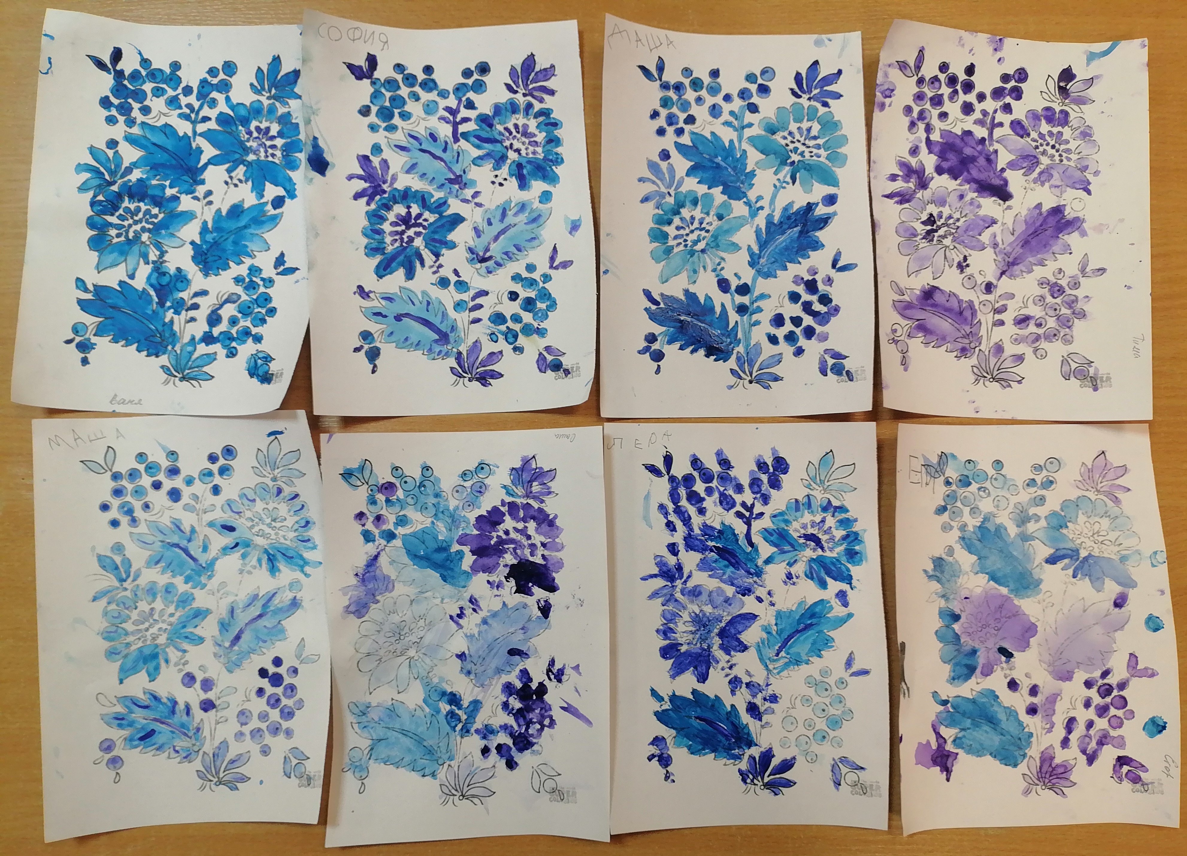 Итогом занятий стали яркие и оригинальные платочки, украшенные цветами и узорами, выполненными в стиле знаменитой гжельской росписи. Каждое изделие получилось уникальным, отражающим индивидуальность ребенка и его восприятие красоты окружающего мира.