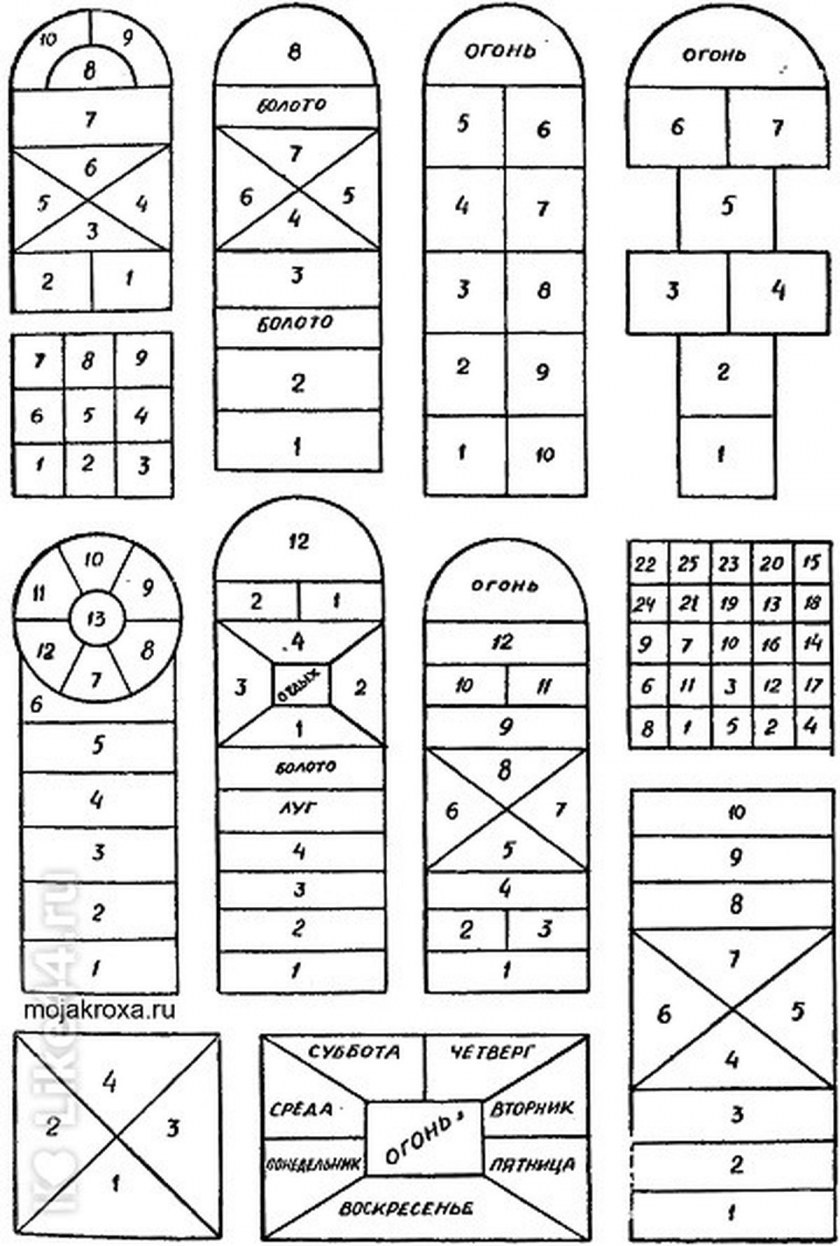 Самый распространенный вариант "классик", это когда один квадрат чередуется с двумя, и ребенок должен пропрыгать всю дорожку не сбившись.