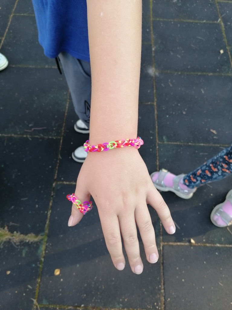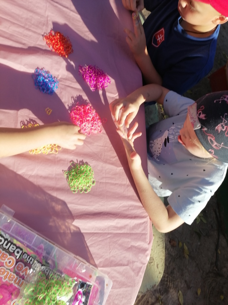 Развивается мелкая моторика - попробуй удержать маленькую резиночку в руке? А если ещё её надо снять/надеть , подцепить пальцами. В итоге дети спели из резинок браслеты , колечки и украшения на шею.