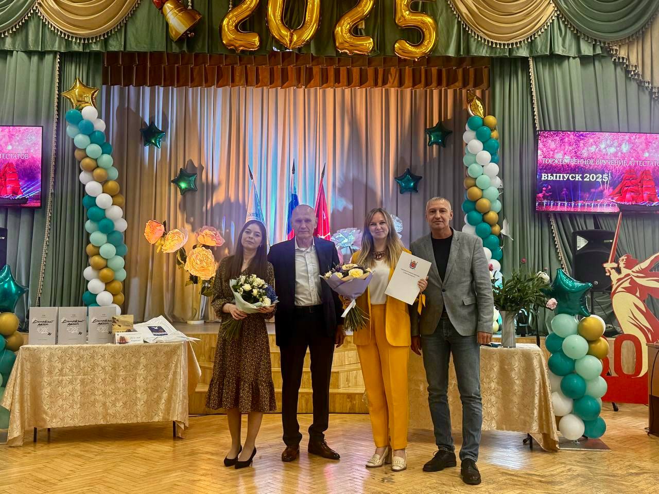 На вручении аттестатов помощник депутата законодательного собрания Санкт-Петербурга А.В. Ходоска - Игорь Нечаев вручил врио директора школы Зинаиде Васильевне Габай благодарственное письмо за преданность делу и значительный вклад в развитие образовательного процесса.